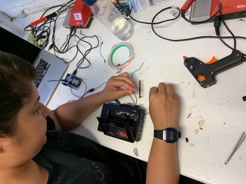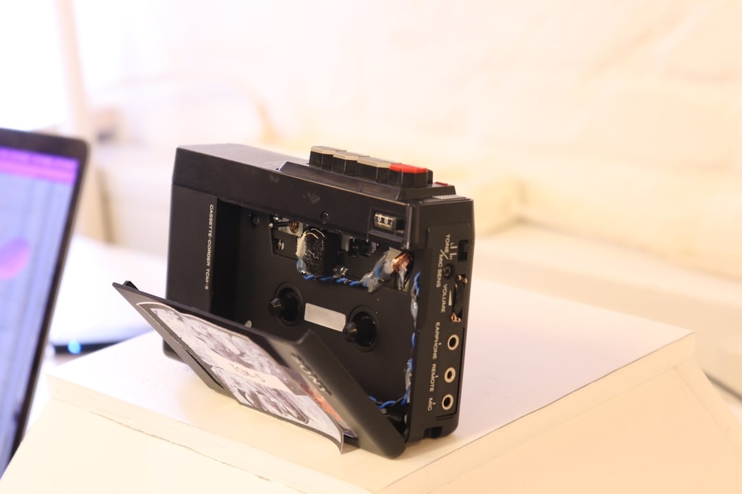 Through incremental prototyping, we increased the number of actions performed by the cassette corder and decided to shift all the wiring internally. Using copper wire and some foam, we created multiple contact switches that would perform an action when a button was pressed.